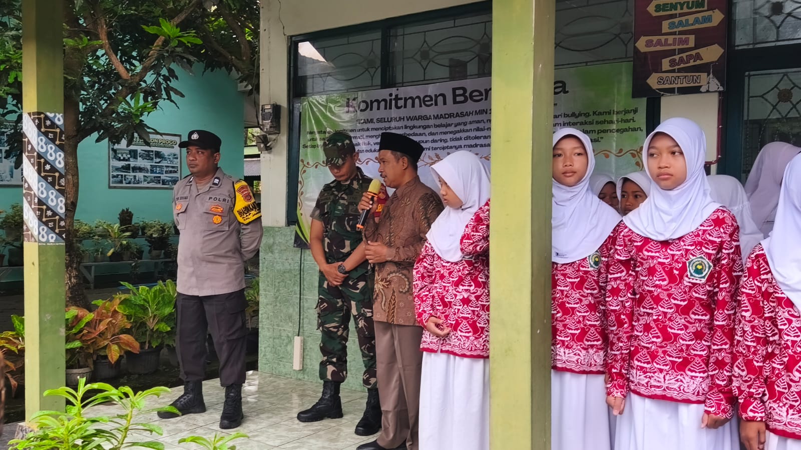 Kulon Progo (MIN1KP) – MIN 1 Kulon Progo menggelar Deklarasi Anti-Bullying sebagai langkah nyata menciptakan lingkungan belajar yang aman dan nyaman bagi seluruh warga madrasah, pada Kamis (15/1/ 2026). Kegiatan ini diikuti oleh siswa, guru, dan tenaga kependidikan, serta dihadiri Bhabinkamtibmas Kalurahan Jangkaran, Temon, Aipda Dian Kusuma Wardani, dan Babinsa, Serda Yohana. Kehadiran unsur TNI dan Polri menambah kuat pesan kebersamaan dalam mencegah perundungan sejak dini.